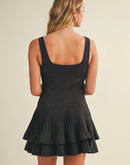- Features a sleeveless design with a structured bodice and tiered pleated skirt