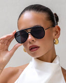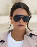 Meet Shay. Your new favorite aviator sunglasses with no metal nose pads. Will not get stuck in your hair. Perfect for any occasion. Look great on any face shape. Experience the perfect blend of luxury and fashion with our Shay Aviator Sunglasses for women. Our premium quality aviator sunglasses are designed to add a touch of class and sophistication to your wardrobe, while the lightweight construction will keep you comfortable all day long. With Shay aviator sunglasses you'll never have to worry again about sunglasses that get stuck in your hair! Boasting an edgy, modern style, these flattering womens sunglasses will help you make waves wherever you go. Plus, the quality materials used make them strong enough to last season after season.
