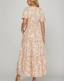 She + Sky Printed Notched Woven Tiered Pintuck Maxi Dress with Side Pockets
