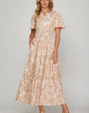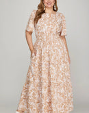 Embrace effortless style and comfort with the She + Sky Printed Notched Woven Tiered Pintuck Maxi Dress. This charming maxi dress features a printed design and a flattering notched neckline. With its tiered pintuck detailing and convenient side pockets, it blends functionality with boutique-worthy elegance, perfect for any occasion.