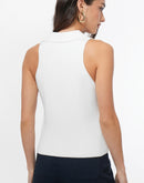 - Features a sleeveless silhouette with a collared V-neckline