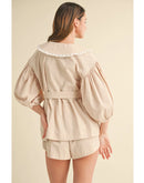- Includes a button-down blouse with a Peter Pan collar and coordinating shorts