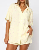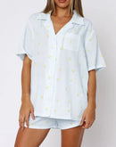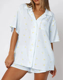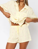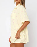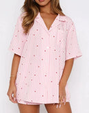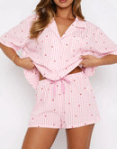 Celebrate Valentine's Day in comfort and style with this Printed Collared Neck Short Sleeve Top and Shorts Set. The buttoned top and pocketed shorts are both practical and cute, while the bow detail adds a playful vibe. Perfect for lounging or a cozy night in, this two-piece set combines comfort with a cheerful, holiday-inspired design.
