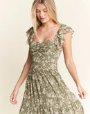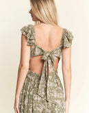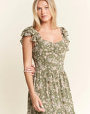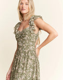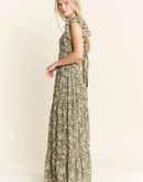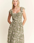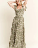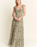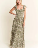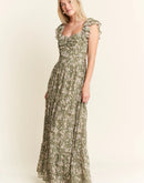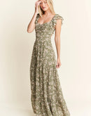 Featuring a delicate green floral print on a lightweight fabric, a dress which is perfect for warm weather occasions. The smocked bodice ensures both style and comfort, while the flutter cap sleeves add a romantic, feminine touch. The square neckline and tiered skirt create a flattering silhouette for various body types. With its elegant full-length design, this dress transitions seamlessly from casual daytime events to more dressed-up occasions.