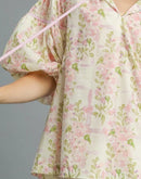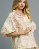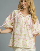 - Umgee Floral Print Puff Sleeve Tie Neck Blouse