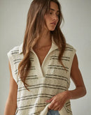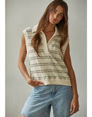 This sleeveless knit top brings effortless polish to everyday styling. Designed with an open V neckline and soft striped texture, it feels comfortable yet refined. Perfect for transitional seasons, it layers easily while still standing out as a boutique-ready statement.