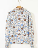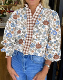Charming and effortlessly polished, this floral blouse features a flattering V-neck accented with plaid frilled trim for a unique boutique touch. The soft floral print and long sleeves create a timeless silhouette that’s perfect for both casual days and dressed-up moments.