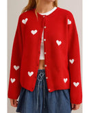 SEO Description: Charming red cardigan with white hearts. Button-front design, crew neck, and relaxed fit. Perfect for layering. Shop premium women's knitwear at The Hinson Label.