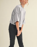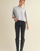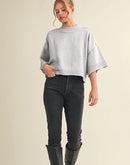 Marled knit mock neck short sleeve sweater + Ribbed mock neckline + Raw edge seam detail + Wide short sleeves with rubbed cuffs + Semi-cropped bodice + Ribbed neckline, cuffs, and hem + Model is 5' 7.5" 30-25-36 and wears a S
