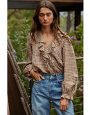Fresh and feminine, this gingham blouse brings charm to everyday styling. Designed with a softly draped ruffle front and an easy silhouette, it balances vintage-inspired appeal with modern wearability. The lightweight woven cotton construction keeps the look polished while remaining comfortable from day to evening.